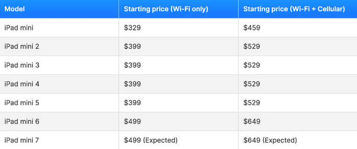 Theo dự đoán của Phone Arena, Apple đã nâng mức giá khởi điểm của iPad mini 6 thêm 100 USD, lên 499 USD (~12.7 triệu đồng), sau khi giữ mức giá 399 USD (~10.1 triệu đồng) từ thế hệ iPad mini 2 (ra mắt tháng 10/2012) đến iPad mini 5 (ra mắt tháng 3/2019). Do đó, Phone Arena dự đoán rằng iPad mini 7 sẽ có giá tương tự như iPad mini 6 và dự kiến như sau:- Phiên bản chỉ Wi-Fi dự kiến có giá từ 499 USD (~12.7 triệu đồng).