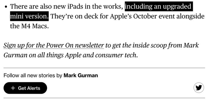 Thông tin về thời điểm dự kiến ra mắt của iPad mini mới (có thể là iPad mini 7) được nêu trong báo cáo của Mark Gurman. Nguồn: Bloomberg.
