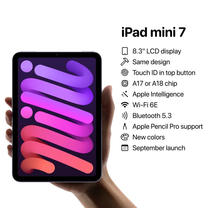 Theo thông tin từ Mark Gurman của Bloomberg (ngày 6/9/2024), Apple có khả năng sẽ giới thiệu mẫu iPad mini mới (có thể là iPad mini 7) vào tháng 10/2024, sau sự kiện ra mắt iPhone 16 Series dự kiến vào rạng sáng ngày 10/9/2024. Tháng 10/2024 cũng có thể là thời điểm Apple công bố các máy Mac mới với chip Apple M4.