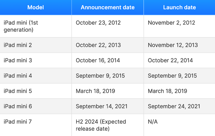 Tuy nhiên, quy tắc này đã thay đổi với iPad mini 5 khi sản phẩm ra mắt sau phiên bản trước đó hơn 3 năm (vào năm 2019). Sau đó, người dùng phải chờ thêm hơn 2 năm để thấy iPad mini 6 ra mắt vào năm 2021. Dựa trên điều này, Phone Arena dự đoán rằng nửa cuối năm 2024 sẽ là thời điểm lý tưởng để công bố sản phẩm mới.