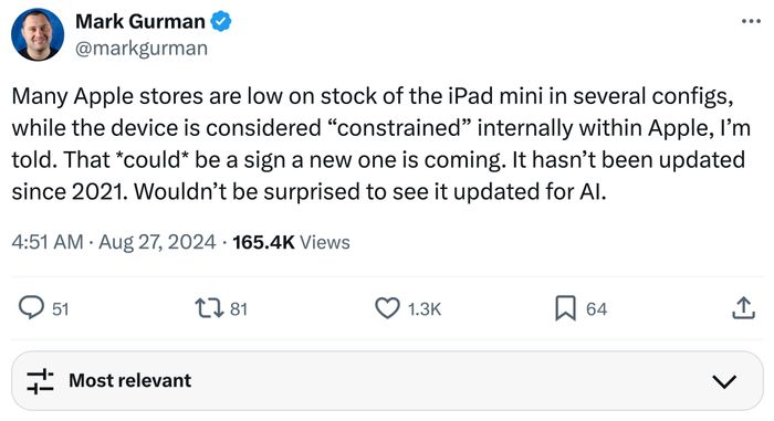 Theo một bài đăng trên X (Twitter), Mark Gurman cho biết việc iPad mini 6 sắp hết hàng tại các cửa hàng Apple là dấu hiệu cho thấy sản phẩm kế nhiệm có thể được công bố sớm.