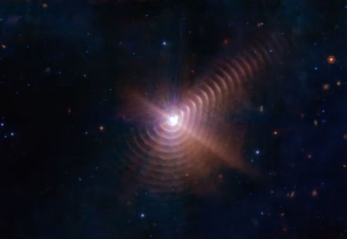 Dòng khí từ cặp đôi ngôi sao Wolf-Rayet 140 tạo ra hình ảnh giống như 'dấu vân tay', được ghi lại bởi kính thiên văn James Webb. Mỗi khoảng 8 năm, cặp ngôi sao này sẽ gần kề nhau và tạo ra hiện tượng này.Theo TheAtlantic