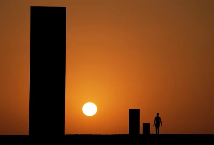 Tác phẩm điêu khắc mang tên “Đông-Tây/Tây-Đông” của nghệ sĩ Richard Serra từ Mỹ, đặt tại sa mạc Dukhan, phía tây thủ đô Doha của Qatar. Bức ảnh này được chụp vào lúc hoàng hôn ngày 9/10.