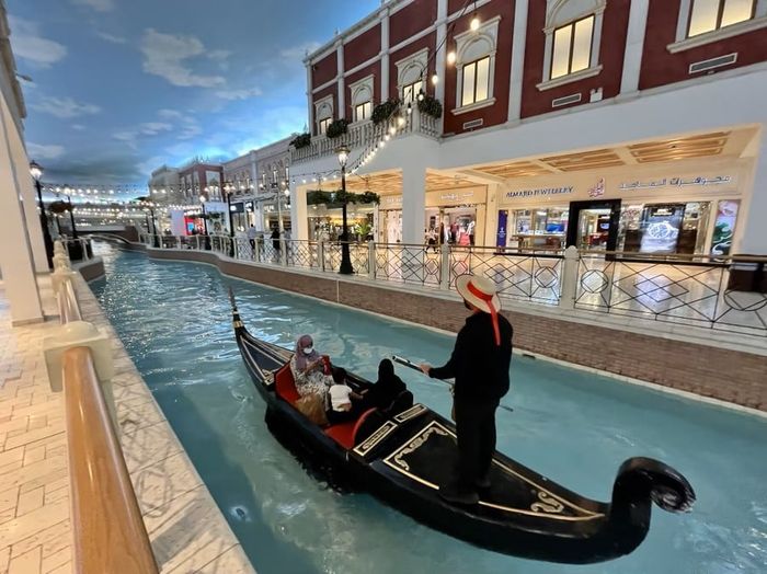 Trải qua con đường uốn khúc trong lòng Trung tâm thương mại Villaggio ở Doha, Qatar. Hình ảnh này gợi nhớ về cảnh di chuyển trên thuyền trong trò chơi Final Fantasy XV.