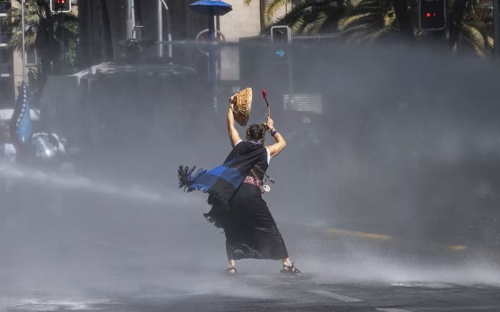 Một phụ nữ thuộc dân tộc Mapuche ở Santiago, Chile, đang đánh trống phản đối việc tổ chức ngày Columbus Day - 10/10/2022. Phía xa có xe phun nước để giải tán các cuộc biểu tình.