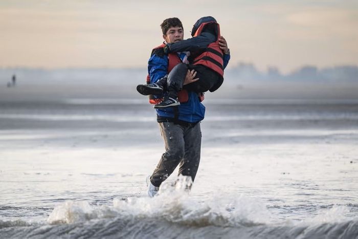 Một người di cư đang ôm bé trai, chạy về phía chiếc tàu tị nạn tại bờ biển Gravelines, Pháp, vượt qua eo biển Măng-xô để đến Anh. Bức ảnh này được chụp vào ngày 12/10.