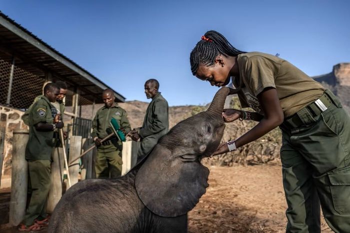 Chú voi con Naesemare, chỉ mới 1 tháng tuổi, đang được chăm sóc tại trung tâm bảo tồn voi Reteti Elephant Sanctuary, nằm trong công viên bảo tồn động vật hoang dã Namunyak Wildlife Conservancy, ở Samburu, Kenya.Một đội cứu hộ đã kịp thời giải cứu một con voi bị mắc kẹt trong một hố cạn khi đang tìm kiếm nước uống trong mùa hạn hán. Đàn voi đã phải bỏ lại con voi sau khi không thể giúp đỡ. Bức ảnh được chụp vào ngày 12/10.