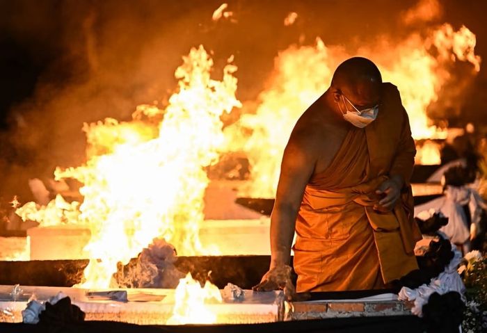 Một nhà sư Thái Lan thực hiện nghi thức hỏa thiêu để tưởng nhớ các nạn nhân trong vụ xả súng ở Nong Bua Lam Phu. Bức ảnh này được chụp vào ngày 11/10.