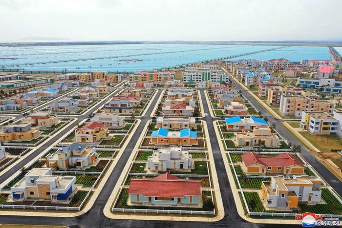 Một khu dân cư tại Bắc Triều Tiên, với phía xa xa là mảnh đất xanh tươi của trang trại nhà kính Ryonpho mới khai trương. Bức ảnh này được công bố bởi Bình Nhưỡng vào ngày 11/10.