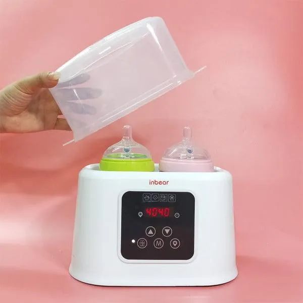 INBEAR IBW-6100 Electronic Milk Warmer and Sterilizer combines 6 essential functions in one compact device: milk warming, sterilization, food warming, water boiling for milk preparation, defrosting, and timer settings. It can warm two wide-neck bottles simultaneously with a convenient, compact lid that makes it portable for outings.