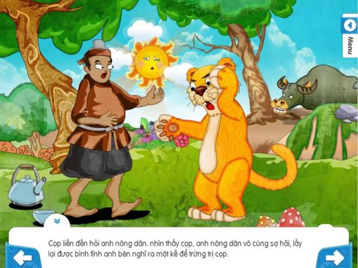 The tiger waited until the plowing ended, and the ox was allowed a break to graze while the farmer went to eat. The tiger approached the ox and asked: