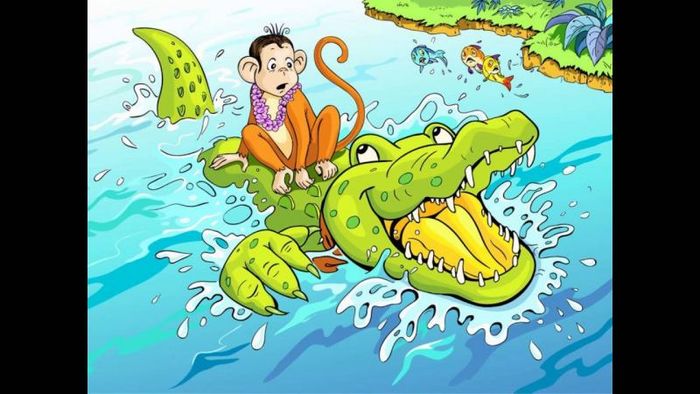 The crocodile invited the monkey to sit on his back for a ride along the river, but secretly, he planned to kill the monkey and take his heart when they reached the middle of the river. When the monkey realized the crocodile's wicked plan, he quickly thought of a clever solution and told the crocodile that he had left his heart on the tree.