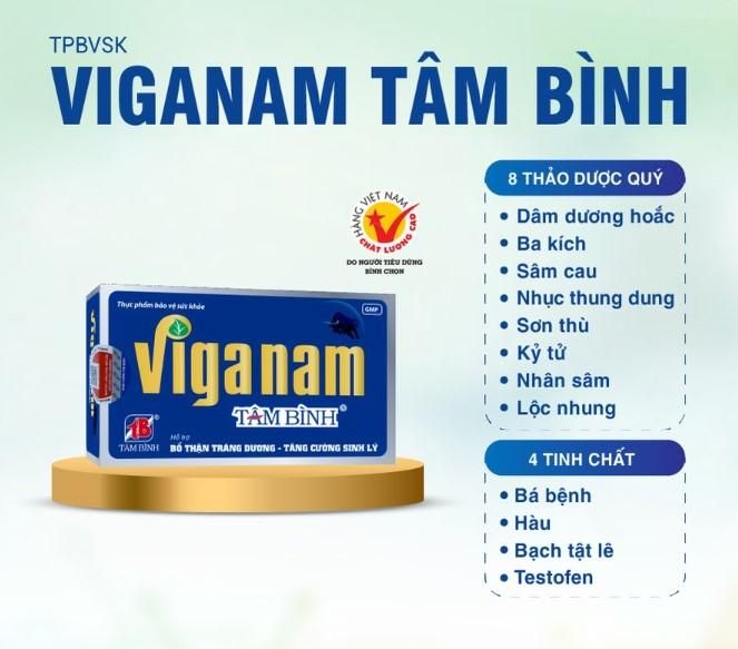 Viganam Tâm Bình is a 100% herbal formula that is safe and gentle, offering lasting benefits for enhancing kidney function, boosting vitality, and improving male sexual health. This supplement helps to invigorate the body and supports overall male well-being.