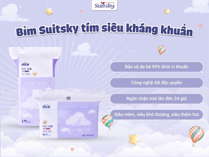 Khám phá thế giới tuyệt vời của Suitsky - Bỉm cao cấp với công nghệ hàng đầu. Hỗ trợ giải quyết các vấn đề như bí bách, khó chịu, khô rát, ngứa ngáy và mẩn đỏ với Vitamin E siêu nhỏ. Đồng thời, kháng khuẩn AB độc quyền giúp ngăn chặn sự phát triển của vi khuẩn. Sản phẩm đạt chuẩn an toàn, thấm hút và chống tràn vượt trội, là sự lựa chọn hoàn hảo cho sức khỏe và thoải mái của bé.
