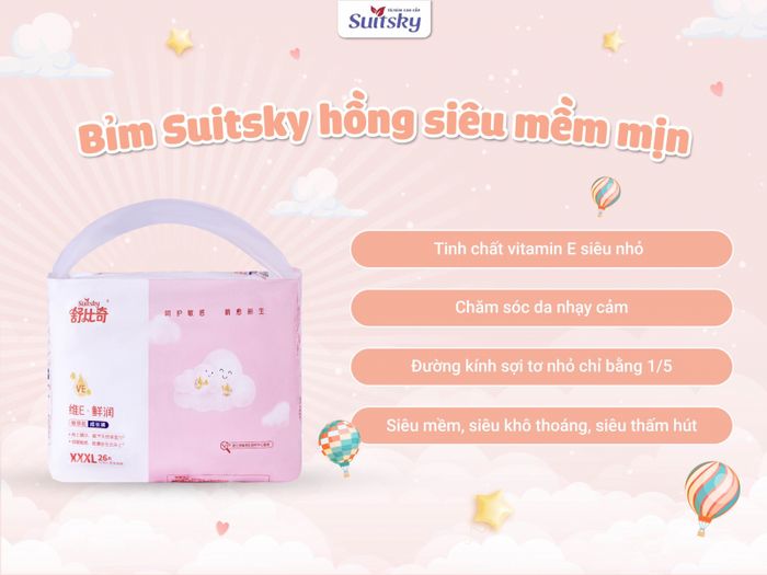 Suitsky - Bỉm số 4 đến từ thương hiệu nội địa Trung, đem đến cho bạn loạt sản phẩm cao cấp được cung cấp độc quyền bởi Solife. Sản phẩm khác biệt với bao bì màu hồng và tím, kết hợp công nghệ Vitamin E hoặc kháng khuẩn AB độc quyền, giúp giải quyết nhanh chóng vấn đề của bé và đảm bảo an toàn.