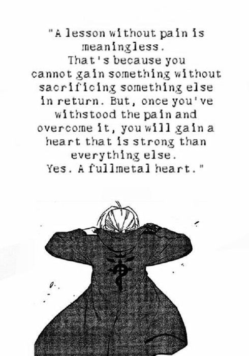 Một bài học không đau đớn là vô nghĩa, vì bạn không thể đạt được điều gì đó mà không phải chấp nhận hy sinh. Nhưng một khi bạn vượt qua và biến nó thành của mình... Bạn sẽ có một trái tim Fullmetal không thể thay thế. Đó là giá trị không thể đo lường được của sự kiên trì và sự hy sinh.