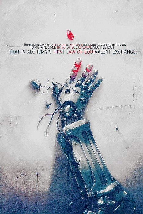 'Loài người không thể đạt được điều gì mà không phải đánh đổi bằng một thứ có giá trị tương đương. Đó là luật đầu tiên của giả kim thuật: Trao đổi ngang giá. Trong những ngày đó, chúng tôi thực sự tin rằng đó là chân lí duy nhất của thế giới.'Điều này không chỉ là nguyên tắc của những người làm giả kim thuật, mà còn là quy luật của mọi sự tồn tại trên thế giới. Sự đạt được không thể xuất hiện nếu không có sự hi sinh. Hòa bình không thể đến nếu không có cuộc chiến tranh giải quyết mâu thuẫn. Không có cái chết, cuộc sống trở nên vô nghĩa. Đây là bản chất của cuộc sống xung quanh chúng ta.