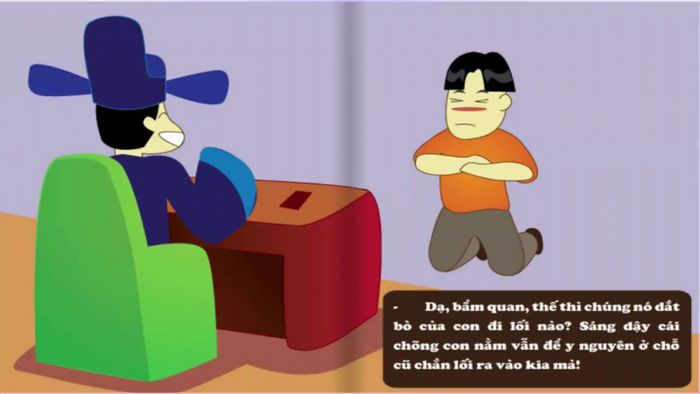 - Ồ, thế à? Thì bẩm quan, chúng nó dắt con bò qua đường nào ạ? Sáng dậy, cái chõng tôi đặt vẫn còn nguyên ở đó chắn đường vào như trước!