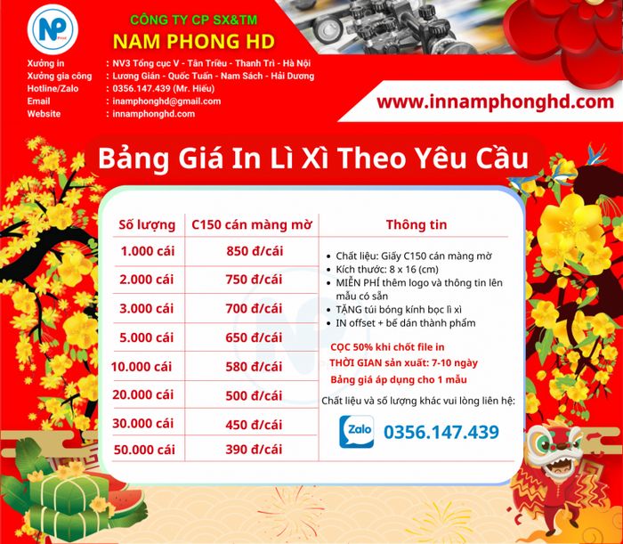 Chỉ có ở in Nam Phong HD, bạn mới có thể tìm thấy kho lì xì với hơn 5000 mẫu phong phú đa dạng, nhiều mẫu độc quyền. Sản phẩm tại Nam Phong được hoàn thiện CNC thành phẩm sắc nét, chất lượng dày đẹp. Nhiều năm kinh nghiệm trong in ấn bao lì xì, Nam Phong HD đã hợp tác với nhiều doanh nghiệp lớn như Viettel, VP Bank, Agribank, Toyota Vietnam...Các cửa hiệu, shop thời trang, tiệm cà phê, trà chanh....trong nhiều năm.