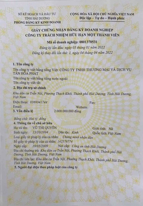 Thông tin khác: Trụ sở: KDC Trần Nội, P. Thạch Khôi, Tp. Hải Dương VPGD: Khu dân cư số 2 mặt đường Bùi viện, Phường Đằng Hải, Quận Hải An, TP. Hải Phòng