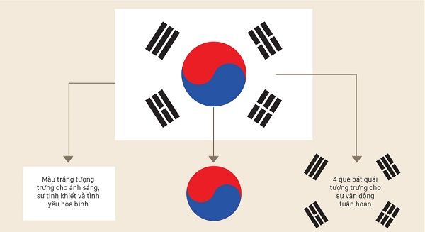 Lá cờ Quốc kì Hàn Quốc với hình thái cực độc đáo, mang trong mình ý nghĩa sâu sắc về triết lí âm dương phương Đông. Vòng tròn ở giữa chia lá cờ thành hai phần bằng nhau.