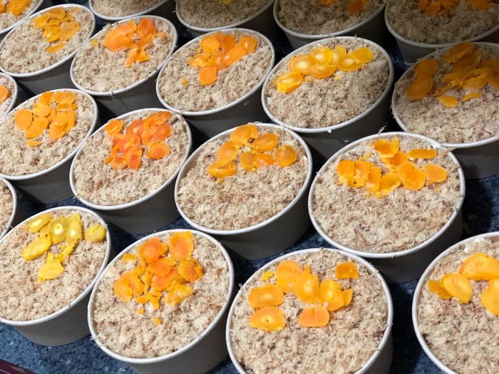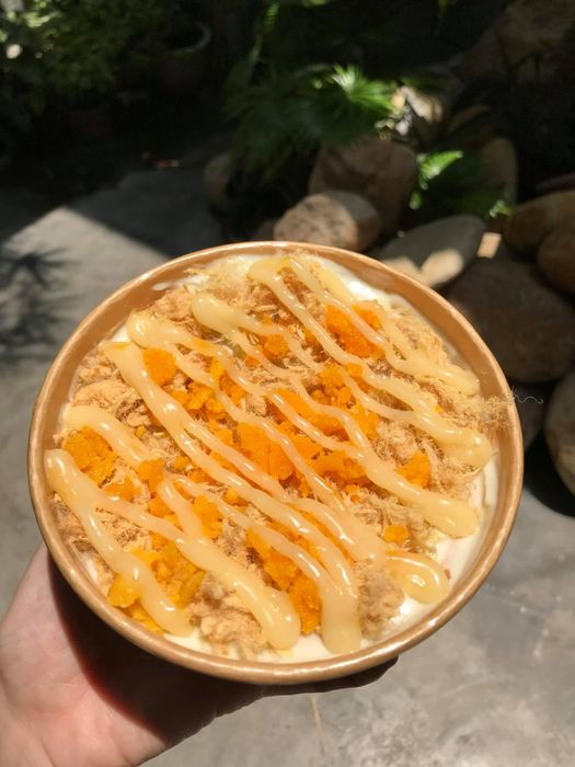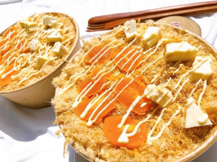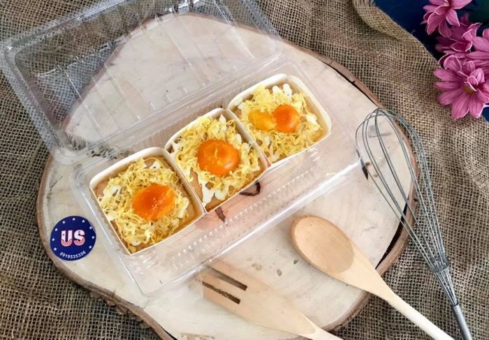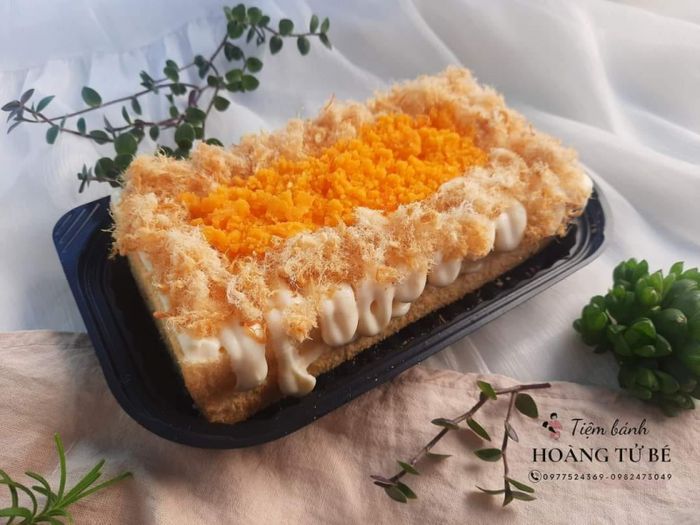 Với cốt bánh mềm mịn, mỏng hơn những tiệm khác nhưng vô cùng cuốn hút với lớp phủ trứng muối và chà bông dày ở phía trên. Bánh tại đây không chỉ độc đáo ở hình thức mà còn ở hương vị. Trứng muối màu vàng tươi, hòa quyện với vị ngọt của bông lan, cùng với chà bông tạo nên sự kết hợp độc đáo, kích thích vị giác.