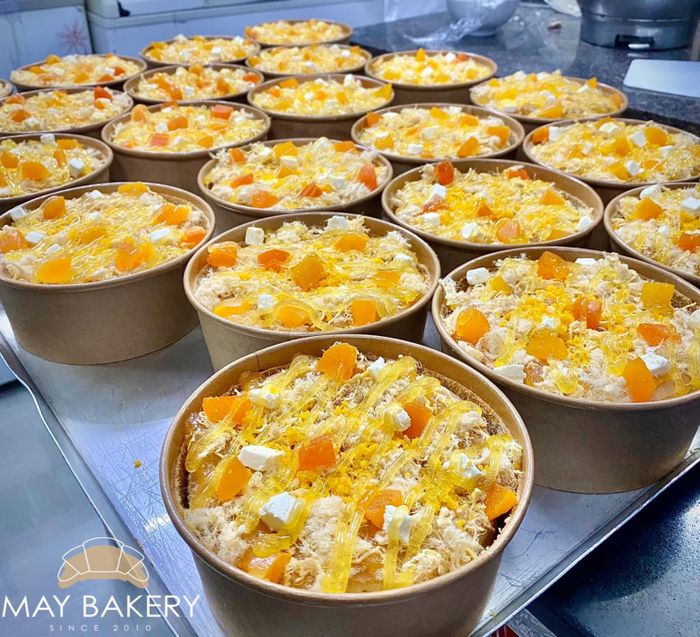 Bánh mềm mịn được đắp đầy sốt và phủ chà bông tươi, kết hợp với trứng muối và phô mai béo ngậy, tạo nên hương vị đậm đà, thơm ngon, đã làm nên tên tuổi của Nhà Hàng - Tiệm Bánh MAY. Đây không chỉ là một món ăn vặt phổ biến mà còn là niềm đam mê của nhiều người. Nếu ghé qua, đừng quên thưởng thức thêm vài chiếc bánh nhỏ sau khi đã 'rinh' một chiếc bông lan trứng muối thơm ngon tại đây nhé.