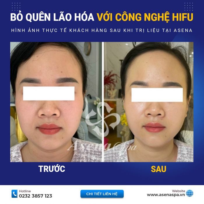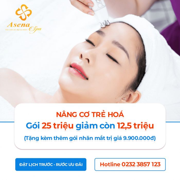 Asena Spa sử dụng công nghệ Hifu để nâng cơ và trẻ hóa da, kích thích tái tạo elastin, collagen dưới da, giúp duy trì sự khỏe mạnh và căng mịn. Công nghệ này không gây đau đớn, chỉ tạo cảm giác da hơi nóng trong quá trình điều trị. Đội ngũ chuyên viên tay nghề cao và trang thiết bị hiện đại đảm bảo mang đến trải nghiệm đặc biệt cho khách hàng.