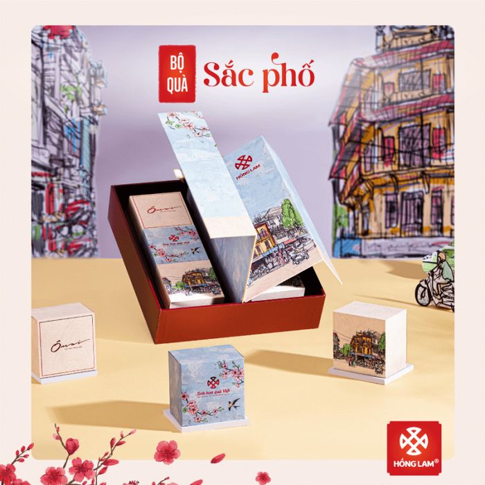 Bộ sưu tập quà Tết 2022 của Hồng Lam mang chủ đề “Phố Xuân Bình An', truyền đạt thông điệp về một năm mới Nhâm Dần Sức khỏe - Bình an - An khang - Thịnh vượng. Bộ quà được thiết kế tinh tế dưới hình hộp và giỏ quà, tạo nhiều lựa chọn hấp dẫn. Hình ảnh phố Cổ sầm uất, đầy màu sắc và ánh nắng ấm áp của mùa Xuân thể hiện may mắn đã đến. Cánh én chao nghiêng trên bầu trời và hoa đào hồng tươi thắm kết hợp tạo nên không khí tươi mới và may mắn cho mùa Tết.