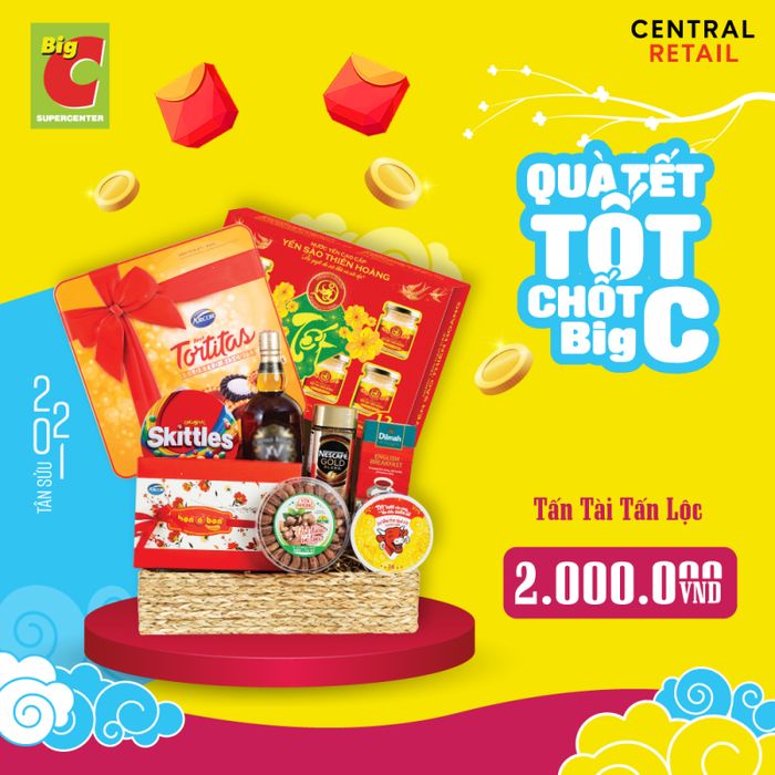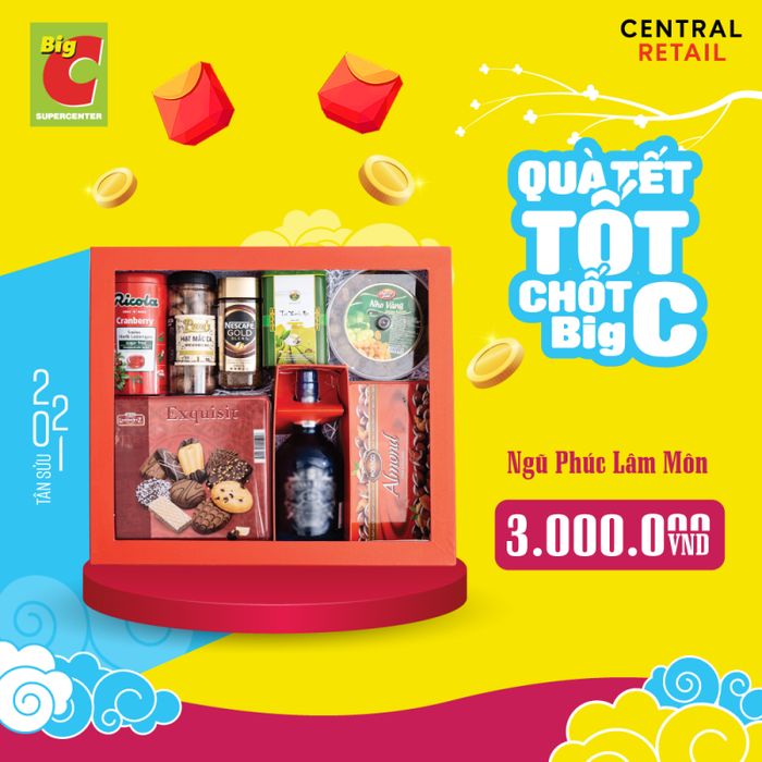 Với hơn 100+ giỏ quà, hộp quà chất lượng từ bình dân đến cao cấp, sang trọng, Big C là địa điểm đáng tin cậy cho các dịp Tết. Sản phẩm được lựa chọn từ những thương hiệu uy tín. Áp dụng chiết khấu lên đến 8%. Giao hàng miễn phí trong bán kính 7km (tại Hồ Chí Minh, Đà Nẵng, Hà Nội) và 10km ở các khu vực khác.