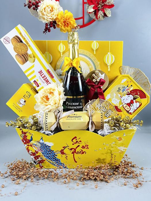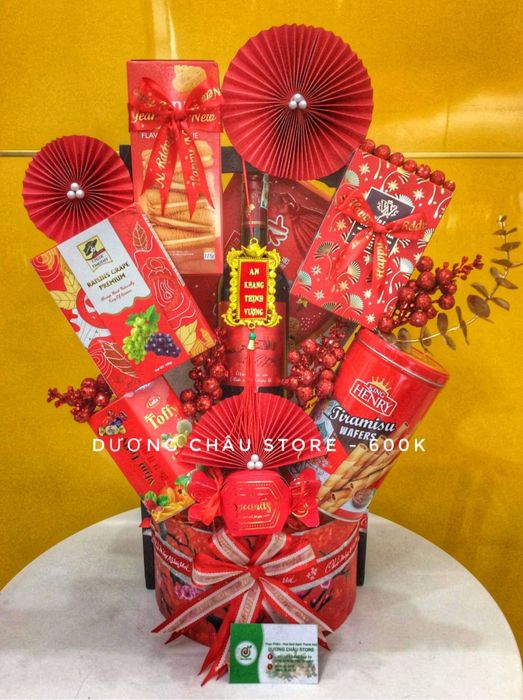 Mỗi sản phẩm trong giỏ quà của Dương Châu Store đều được chọn lựa cẩn thận, đa dạng từ rượu, trà đến bánh kẹo, hạt,... Thiết kế mang đậm tinh thần Tết truyền thống với gam màu đào đỏ, mai vàng và lời chúc an lành. Bạn còn có thể điều chỉnh nội dung quà và kèm theo thiệp chúc mừng Năm Mới theo ý muốn.