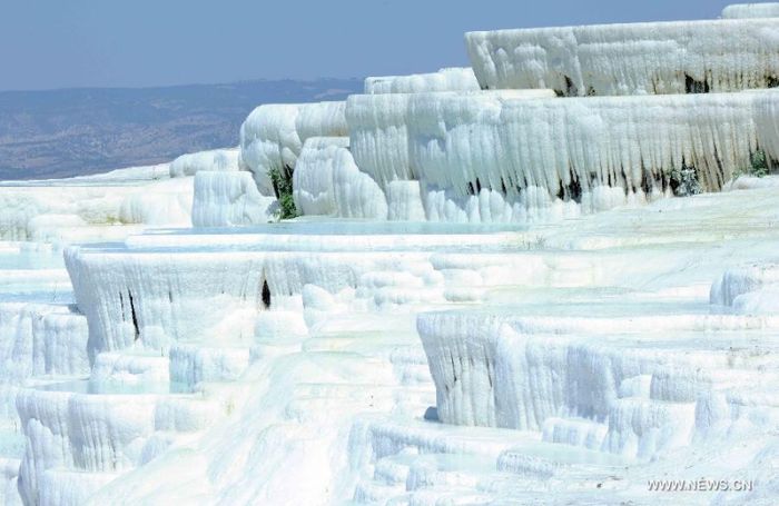 Được biết đến với tên gọi 'lâu đài bông,' Pamukkale hấp dẫn với các lớp carbonate canxi cứng rắn theo thời gian, tạo nên bức tranh trắng tinh khôi như tuyết phủ và các đá vôi sắp xếp như vỏ sò. Nước suối tạo ra các hồ nhỏ màu xanh ngắt trên các bậc thang, nơi du khách có thể tận hưởng sự mát lạnh của nước xanh ngọc bích này.