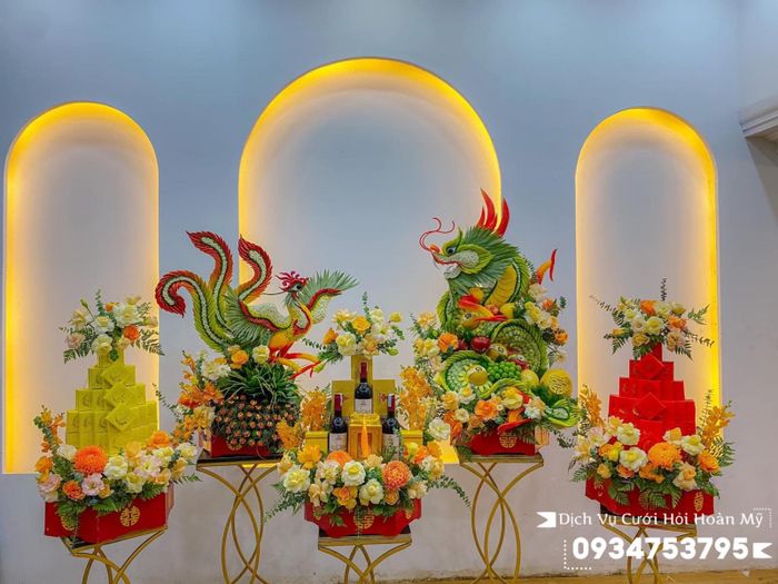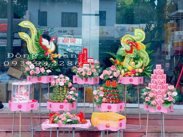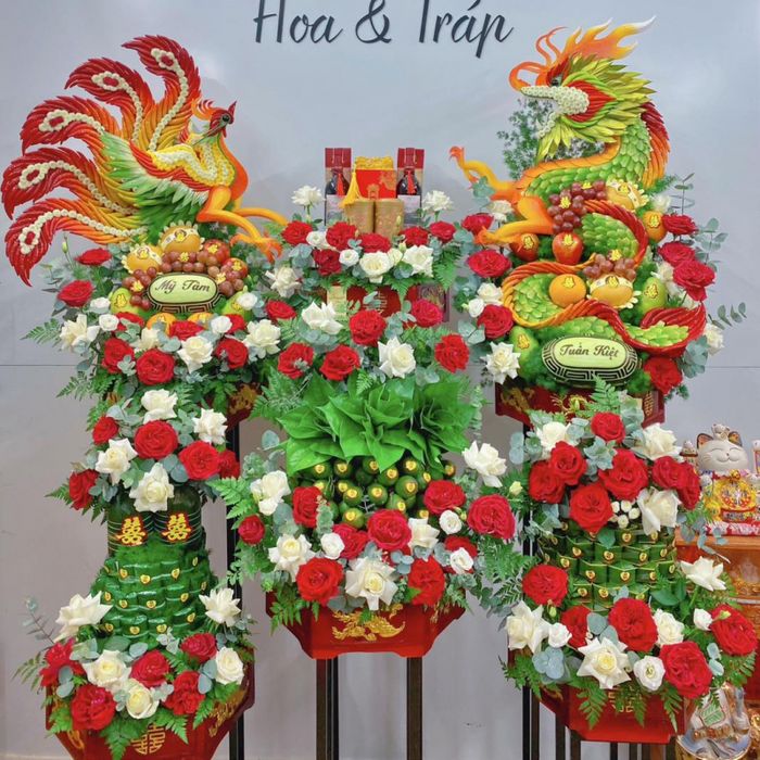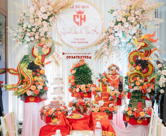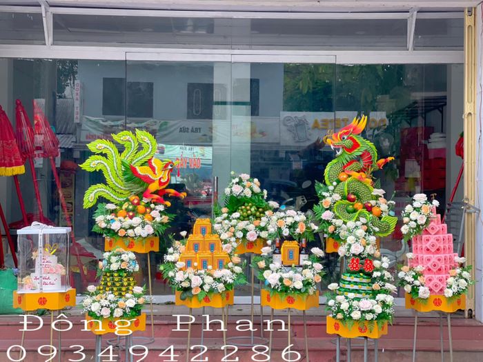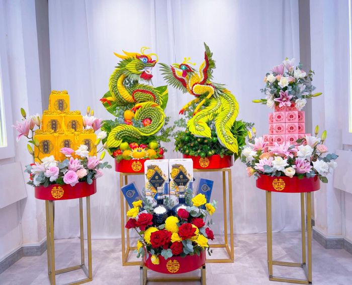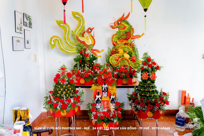 Là một trong những địa chỉ uy tín cung cấp dịch vụ cưới hỏi, Quỳnh Flower cam kết mang đến mâm lễ đẹp nhất với những chi tiết rồng, phụng tinh tế. Ngoài ra, cửa hàng còn chuyên thiết kế hoa cưới với đa dạng màu sắc và kiểu dáng để đáp ứng mọi sở thích của khách hàng.