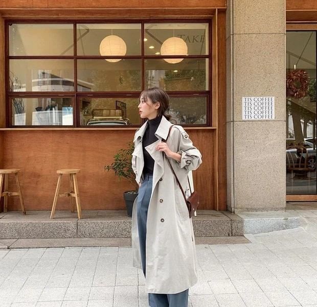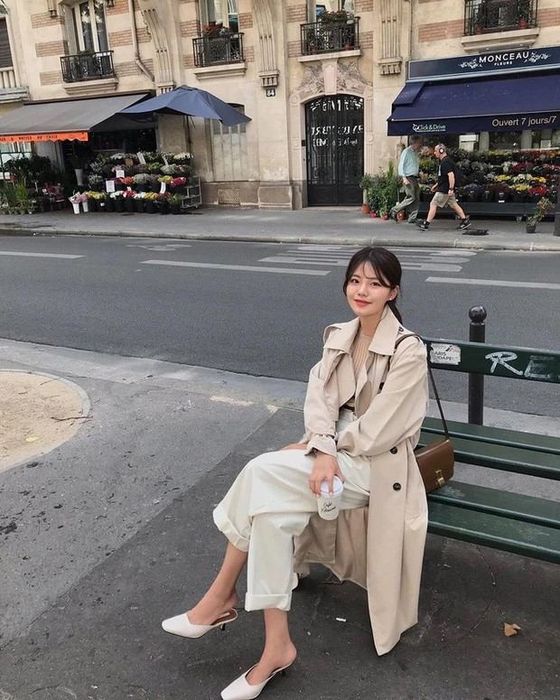 Alternatively, you can switch things up by wearing skinny jeans for a more dynamic look. Since the trench coat can be quite bulky, it's best to pair it with slim-fitting pants when wearing a longer coat, either knee-length or ankle-length. A simple t-shirt or one with a logo would work great, along with white sneakers for a stylish and comfortable touch that adds energy to the whole outfit.