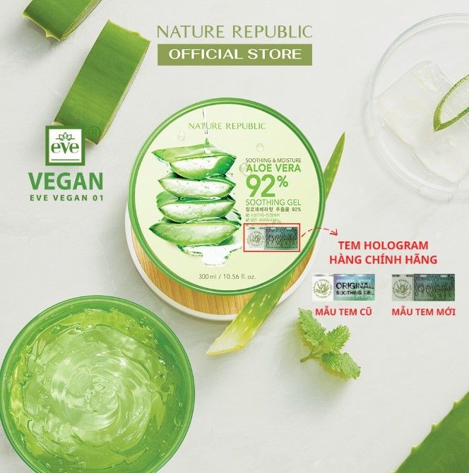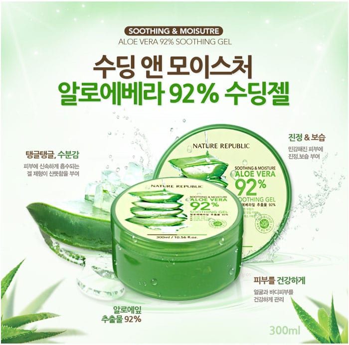 Gel lô hội dưỡng đa năng Nature Republic Soothing & Moisture Aloe Vera 92% Soothing Gel là sản phẩm giúp làm mềm và bổ sung độ ẩm cho da, được chiết xuất từ lô hội hữu cơ được kiểm định bởi Tổ chức chứng nhận sản phẩm hữu cơ California (CCOF). Sản phẩm giúp làm dịu và bảo vệ làn da nhạy cảm, mang lại làn da mềm mại và mịn màng với độ ẩm đầy đủ. Gel dưỡng đa năng với 92% chiết xuất từ lô hội, thẩm thấu nhanh chóng, giúp làm dịu và tăng cường độ ẩm, không gây cảm giác nhờn dính. Có thể sử dụng cho mặt, tóc và cơ thể.