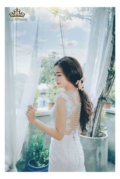 Mái tóc của cô dâu được giữ nguyên tự nhiên, chải mượt sau đó buộc gọn thành đuôi ngựa, sau đó đánh rối phần trên đỉnh đầu và thêm những phụ kiện trang trí đơn giản như bông hoa để tạo điểm nhấn ấn tượng. Kiểu tóc này không cầu kỳ nhưng chắc chắn sẽ mang đến cho cô dâu vẻ đẹp dịu dàng, tự nhiên.