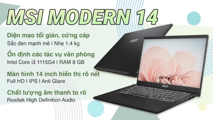 Laptop MSI Modern 14 C11M i3 1115G4 (011VN) với bộ nhớ RAM 8GB và ổ cứng SSD 512GB.