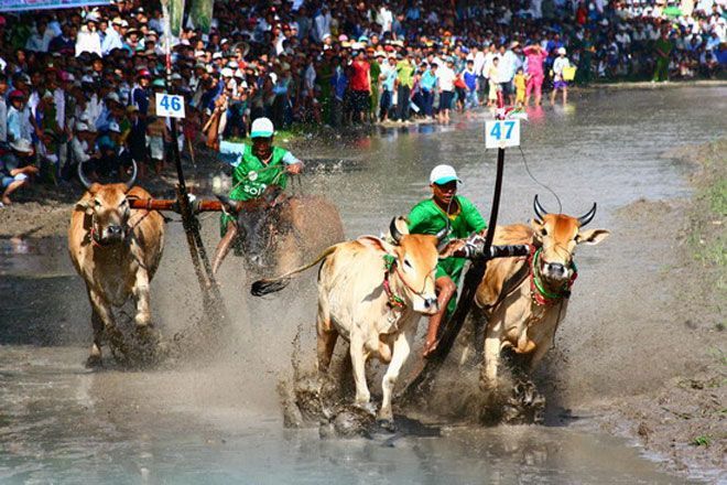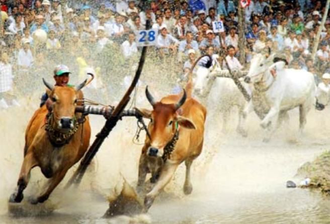 Tổ chức hội đua bò truyền thống. Để chuẩn bị cho cuộc đua bò, họ chọn một khoảnh ruộng bằng phẳng, chiều dài chừng 200 m, ngang 100 m có nước xăm xắp, được "trục" xới nhiều lần cho có độ trơn của bùn, bốn bên có bờ bao và điểm đích có đoạn đường trống để làm độ dừng an toàn cho bò. Đoạn đường đua chính chỉ cần 120m theo khoảnh ruộng cặp sát bờ bao. Nơi xuất phát được cắm 2 cây cờ màu xanh, đỏ mỗi cây cách nhau 5m, và tại điểm đích cũng vậy. Đôi bò nào đứng ở vị trí cây cờ màu gì thì điểm đích cũng theo màu của cây cờ đó. Trước khi vào cuộc đua, họ chọn từng đôi bò với nhau hoặc bốc thăm và thoả thuận một số quy định cần thiết như ai sẽ đi trước, đi sau... Nhưng thông thường đôi đi sau có phần ưu thế hơn. Nếu trong khi đua, đôi bò nào chạy tạt ra khỏi đường đua sẽ bị loại và đôi bò sau giẫm lên giàn bừa của đôi bò trước là thắng cuộc. Còn người điều khiển phải đứng thật vững nếu bị ngã hoặc rơi ra khỏi giàn bừa coi như thua cuộc. Khi bắt đầu lệnh xuất phát của trọng tài, người điều khiển chích mạnh cây xà-lul vào mông con bò, bò bị đau phóng nhanh về phía trước, quan trọng là phải chích cho đều cả hai con thì vận tốc của đôi bò mới quyết liệt và hấp dẫn.