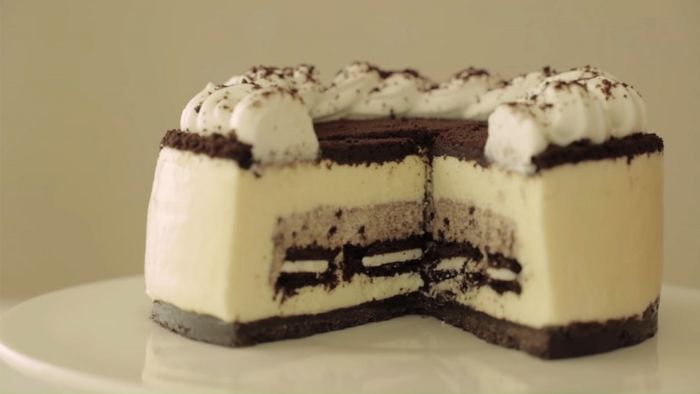- Lấy khuôn đế bánh oreo từ tủ lạnh ra, sau đó đổ hỗn hợp kem phô mai đã trộn vào khuôn. Cho khuôn vào ngăn mát tủ lạnh ít nhất 2 tiếng để bánh đông hoàn toàn. Khi bánh đã đông lại, hãy lấy bánh ra khỏi khuôn và trang trí theo sở thích của bạn.