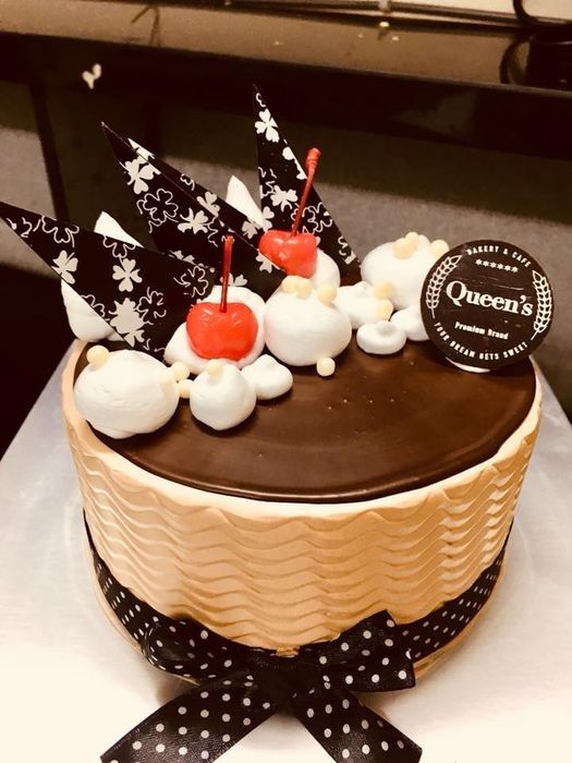 - Phun kem bơ lên mặt bánh, sau đó dùng tấm bìa mỏng để phân bổ kem xung quanh bánh. Sử dụng túi bắt kem có đầu nhỏ để trang trí bánh theo ý thích.