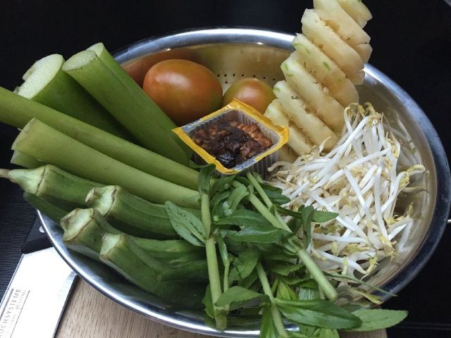 Nguyên liệu: Me chín, bạc hà, thơm, cà chua, giá đỗ, ngò om, đậu bắp, đậu hũ non, dầu ăn, đường trắng, muối, bột ngọt, nước tương.