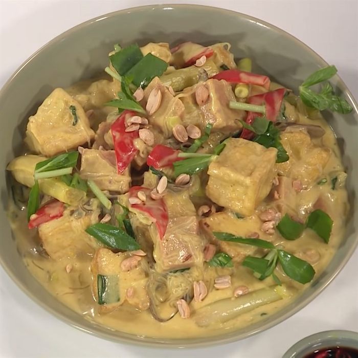 Nguyên liệu: Đậu hũ bi, ham chay, nấm mèo, bún tàu, nước cốt dừa, đậu phộng, hành boa rô, sả, ớt sừng, rau om, ngò gai, bột nghệ, bột cà ri, hạt nêm chay, đường, bột ngọt, dầu ăn. Cách làm: Ngâm nấm mèo, chuẩn bị nguyên liệu, ướp đậu hũ, xào đậu hũ với nước cốt dừa và các nguyên liệu khác.