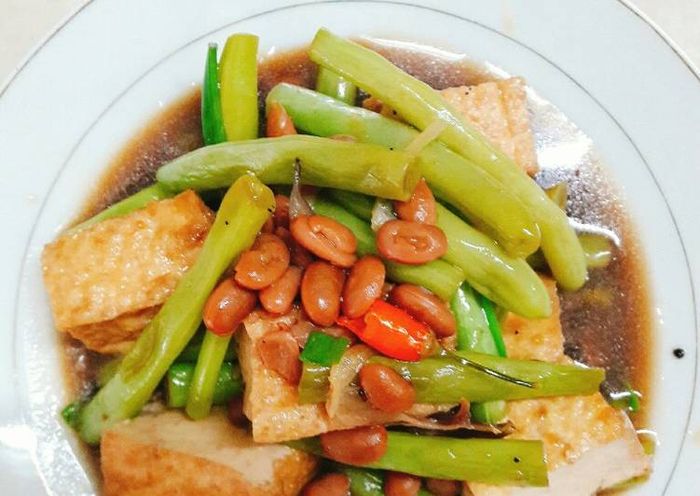 Nguyên liệu: Tàu hủ chiên, đậu tây hoặc đậu cô ve, tương hột, nước tương, đường, hành lá, tiêu. Cách làm: Xào chung tất cả các nguyên liệu, nấu nước lọc, đường cho thấm gia vị, thêm hành và tắt bếp. Món tàu hũ kho tương thơm ngon sẽ làm bạn hài lòng!