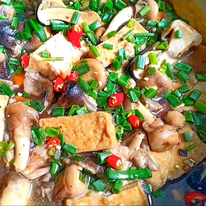 Nguyên liệu: Đậu hủ khuôn, nấm đùi gà, nấm đông cô tươi, nấm rơm, hành boarô, nước mắm chay, hạt nêm chay, đường, tương cà Ketchup.