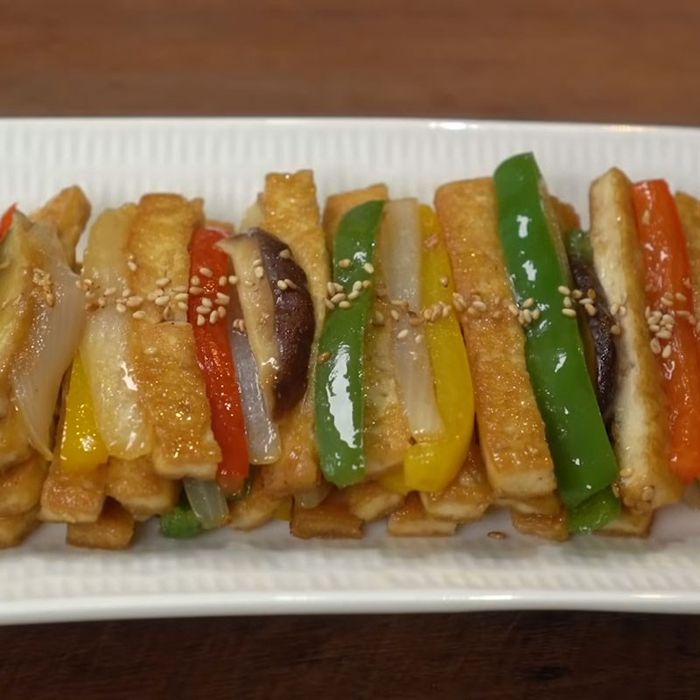 Nguyên liệu: Đậu hũ, ớt chuông, nấm đông cô tươi, hành tây, mè rang, nước tương, dầu mè, dầu ăn, đường ngô, muối.