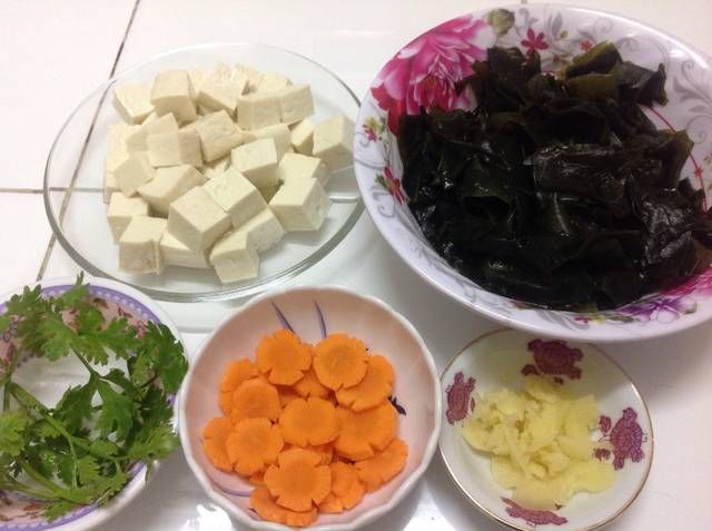 Nguyên liệu: Đậu hũ non, rong biển khô, cà rốt, nước lọc, hạt nêm chay, gừng tươi, ngò rí, dầu mè, tiêu xay. Cách làm: Ngâm rong biển, chuẩn bị nguyên liệu, ướp rong biển, nấu canh.