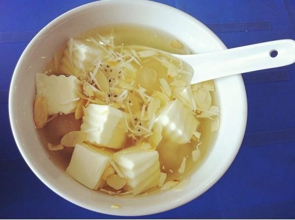 - Bước 3: Rang hạnh nhân. Luộc nhãn. Cho thạch, nhãn, hạnh nhân vào chén, chan nước đường lên trên.