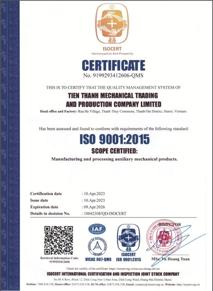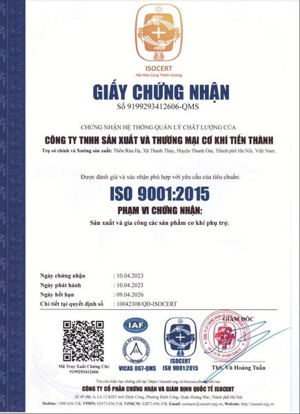 Công Ty TNHH Sản Xuất Và Thương Mại Cơ Khí Tiến Thành, thành lập năm 2015, tiền thân là CƠ SỞ SẢN XUẤT CƠ KHÍ HẢO ĐẤU với hơn 20 năm kinh nghiệm, chuyên cung cấp dịch vụ gia công cơ khí đột dập theo yêu cầu trong ngành cơ khí công nghiệp phụ trợ. Chúng tôi có trụ sở tại Thôn Rùa Hạ, Xã Thanh Thùy, Huyện Thanh Oai, Hà Nội và hoạt động trên toàn quốc cũng như quốc tế. Các dịch vụ gia công của chúng tôi bao gồm: ★ Gia công cơ khí đột dập các linh, phụ kiện thùng xe ô tô tải ★ Gia công cơ khí đột dập các linh, phụ kiện cửa chống cháy ★ Gia công cơ khí đột dập các linh, phụ kiện ngành gia dụng Chúng tôi cam kết cung cấp sản phẩm chất lượng cao nhất với sự hài lòng của khách hàng là mục tiêu hàng đầu. Chúng tôi hướng tới sự vững mạnh về tổ chức và phát triển thương hiệu, trở thành địa chỉ tin cậy trong và ngoài nước. Tiến Thành đảm bảo: − Chất lượng: Sản phẩm đáp ứng tiêu chuẩn, quy chuẩn hiện hành, chứng nhận ISO 9001:2015, gia công chính xác theo mẫu và thiết kế bản vẽ với tiến độ sản xuất nhanh chóng. − Thời gian: Bàn giao đúng tiến độ và mẫu mã thiết kế. − Nhân sự: Đội ngũ nhân viên giàu kinh nghiệm, tay nghề cao, tư vấn tận tình. − Chi phí: Giá cả cạnh tranh và dịch vụ giao hàng toàn quốc. Khách hàng tiêu biểu của chúng tôi bao gồm các công ty lớn như Hòa Phát, Thaco, Sunhouse, Delta, và Steel Friends. Cơ Khí Tiến Thành rất mong có cơ hội hợp tác với quý khách hàng và cam kết mang đến sự hài lòng tối đa với phương châm “Tốc Độ − Chất Lượng − Uy Tín.”