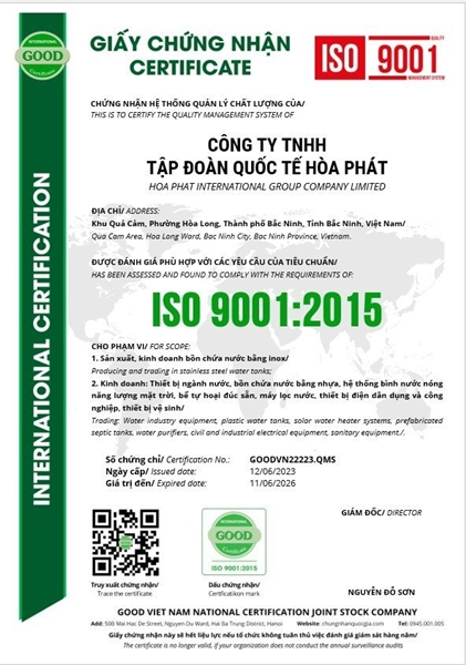 ►► Hòa Phát - Hoà đồng, phát triển vững bền tương lai ◄◄ Tập Đoàn Quốc Tế Hòa Phát, với nhiều năm kinh nghiệm trong lĩnh vực sản xuất và kinh doanh, chuyên cung cấp các sản phẩm chất lượng cao như: 1. Bồn nước – Bồn nước inox, bồn nước nhựa, bể nước ngầm, bồn tự hoại, bồn nước công nghiệp – Đa dạng dung tích: 300L - 12.000L – Chất liệu: Inox, nhựa, bền bỉ theo thời gian – Ứng dụng công nghệ tự động gập mép chân không theo tiêu chuẩn Châu Âu, loại bỏ mối lo rò rỉ đường hàn truyền thống – Hệ thống quản lý chất lượng theo tiêu chuẩn ISO 9001:2015 2. Thái dương năng – Thái Dương Năng Titan 316 58 chịu áp – Thái dương năng Sơn Hà dòng FLAT – Thái dương năng Sơn Hà dòng GOLD – Thái dương năng Sơn Hà dòng Silver – Thái dương năng Sơn Hà dòng TITAN 3. Thiết bị điện, nước – Thiết bị điện Sunmax – Ống nước PPR, ống nước PVC, phụ kiện ống nước – Máy lọc nước RO, chậu rửa inox 304, chậu rửa bát inox – Bình nước nóng dạng vuông, bình nước nóng dạng chữ nhật 4. Sản phẩm khác – Bồn nhựa đứng 300L, bồn nhựa đứng 500L, bồn nhựa ngang 500L, bồn nhựa ngang 700L, bồn nhựa đứng 1000L, bồn nhựa đứng 2000L, bồn nhựa ngang 1000L, bồn nhựa ngang 1200L, bồn tự hoại Septic 1600L – Bồn nước công nghiệp ngang 7000L, 10000L, 12000L Với những sản phẩm chất lượng cao và dịch vụ bán hàng uy tín, chuyên nghiệp, Hòa Phát đã khẳng định được vị thế của mình trên thị trường, nhận được nhiều sự tín nhiệm và đánh giá cao từ phía khách hàng. Chúng tôi rất hân hạnh được hợp tác cùng quý khách! ________________________ Danh sách nhà phân phối: 1. Tỉnh Thái Nguyên – NPP Việt Ly: Tổ 2, P. Thịnh Đán, TP. Thái Nguyên, Thái Nguyên – Hotline: 02083840007 2. TP. Hà Nội – NPP Đông Mai: Chúc Sơn, Chương Mỹ, Hà Nội – Hotline: 0967899665 3. Tỉnh Nam Định – NPP Đức Luyện: KM21+500 QL21B, Liêm Hải, Trực Ninh, Nam Định – Hotline: 0915455327 – NPP Đức Minh: TT. Cổ Lễ, Trực Ninh, Nam Định – Hotline: 0946525526 4. Tỉnh Nghệ An – NPP Huy Hoàng: X. Quỳnh Châu, H. Quỳnh Lưu, Nghệ An – Hotline: 0979949009 – NPP Anh Tiến: Xóm Vạn Yên, Hòa Sơn, Đô Lương, Nghệ An – Hotline: 0979504303 5. Tỉnh Hải Dương – NPP Chị Tuyến: Thôn La Ngoại, X. Ngũ Hùng, Thanh Miện, Hải Dương – Hotline: 0972527553 6. Tỉnh Thanh Hóa – NPP Tống Gia: Xuân Sơn, Thanh Sơn, TX. Nghi Sơn, Thanh Hoá – Hotline: 0866688595 7. Tỉnh Ninh Bình – NPP Vinasino: Khu Phố Đông, TT. Yên Ninh, Huyện Yên Khánh, Ninh Bình – Hotline: 0973007645 8. Tỉnh Bắc Giang – NPP Hùng Kiệt: Yên Mỹ, Lạng Giang, Bắc Giang – Hotline: 0989147129 9. Tỉnh Thái Bình – NPP Đỗ Gia Phát: Lô 31B.A4 Khu Quy Hoạch Dân Cư Đông Mỹ, TP Thái Bình – Hotline: 0943190829 Công ty TNHH Tập Đoàn Quốc Tế Hòa Phát Địa chỉ: Khu Quả Cảm, Phường Hoà Long, Thành Phố Bắc Ninh, Bắc Ninh, Việt Nam Chúng tôi tự hào là nhà sản xuất và thương mại hàng đầu trong lĩnh vực này với mạng lưới phân phối rộng khắp trên toàn quốc.
