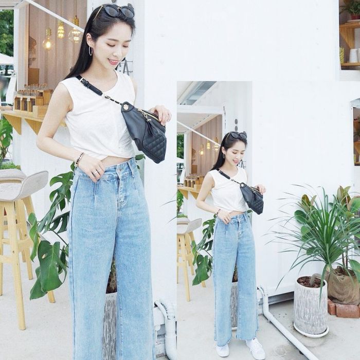 Với mẫu quần jean thụng nữ, bạn nên chọn áo không quá thùng thình. Áo dài cũng có thể sơ vin vào quần, nhưng cần cẩn thận để tránh trông luộm thuộm. Lựa chọn chiếc áo croptop gọn gàng, khoe vòng 2 gợi cảm là giải pháp hoàn hảo.
